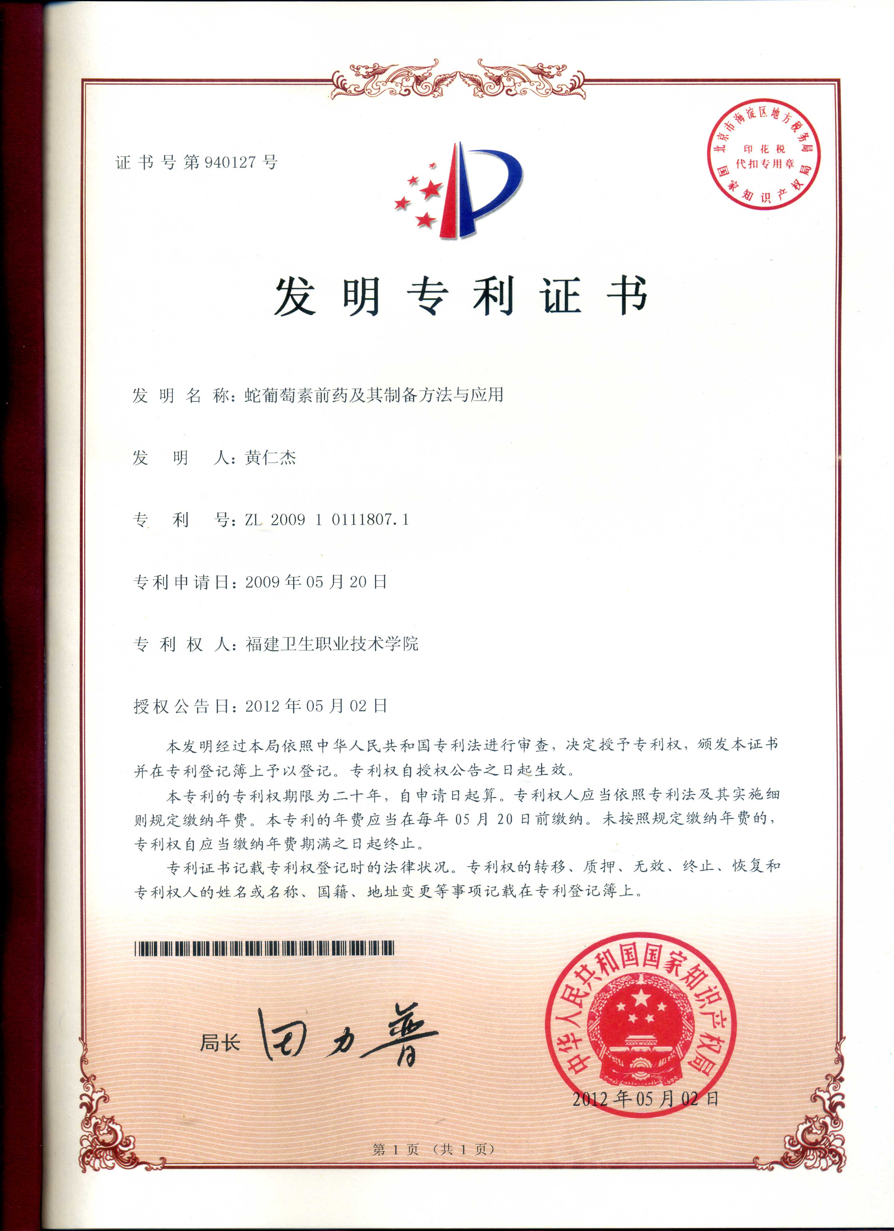 日前,我院食品藥品研究所黃仁杰副教授研究的成果“蛇葡萄素前藥及其制備方法與應(yīng)用”獲國家知識產(chǎn)權(quán)局頒發(fā)國家發(fā)明專利證書(專利號:ZL200910111807.1),授權(quán)公告日為:2012年5月2日。
