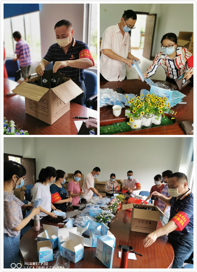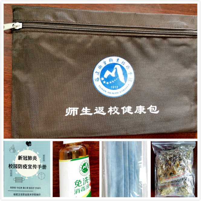 口罩、免洗洗手液、中藥涼茶、防疫手冊、體溫計、消毒棉球,經(jīng)過系書記、系主任和各位老師、輔導員的手,帶著全系教職工對學生的愛,一個個裝滿了健康包。