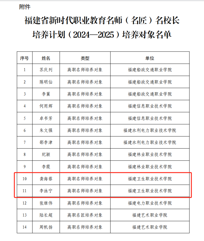近日,福建省教育廳公布《新時代職業(yè)教育名師(名匠)名校長培養(yǎng)計(jì)劃(2024-2025)培養(yǎng)對象名單》,我校龔海蓉、李泳寧兩位教師成功入選福建省新時代職業(yè)教育高職名師培養(yǎng)對象。