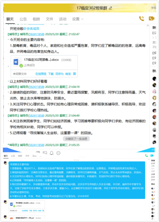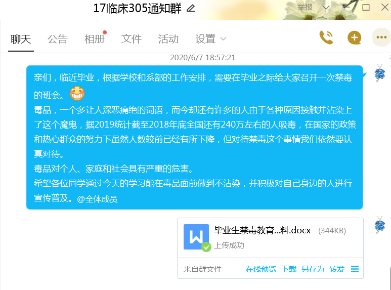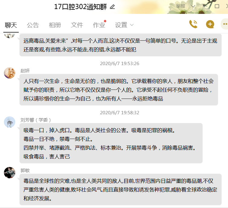 2020年6月26日是“國際禁毒日”,在畢業(yè)生離校之前,臨床醫(yī)學系各畢業(yè)班通過QQ、騰訊課堂等網(wǎng)絡(luò)平臺,線上進行禁毒教育,召開“珍愛生命,拒絕毒品”主題班會,畢業(yè)班學生集體學習有關(guān)禁毒教育材料。