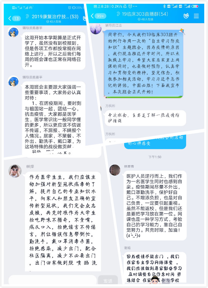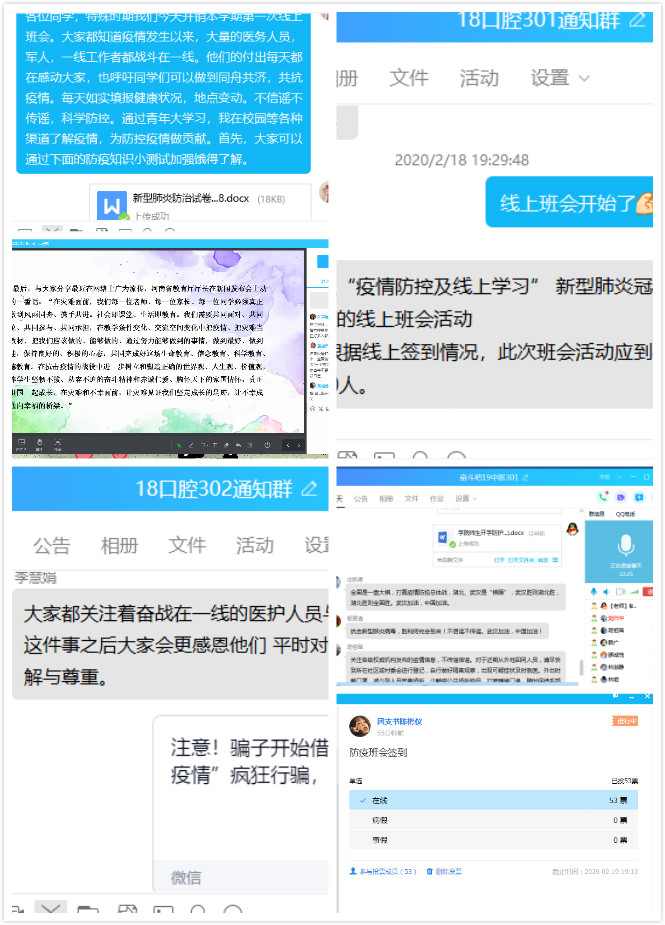開學(xué)的第一周,根據(jù)學(xué)校的安排,臨床系組織學(xué)生開展“停課不停學(xué)”的線上教學(xué)活動(dòng),同時(shí)輔導(dǎo)員們也積極組織各班學(xué)生開展了“防疫”班會(huì)。做“守護(hù)者”,擔(dān)使命、保安康。教育引導(dǎo)學(xué)生要時(shí)刻與祖國站一起,團(tuán)結(jié)一心,抗擊疫情,不信謠不傳謠,不漏報(bào)、不瞞報(bào)個(gè)人情況,重申衛(wèi)生防護(hù)的重要性。做“識(shí)途者”,要做到游必有方。告知學(xué)生以大局為重,珍視自己和他人的生命,務(wù)必按照學(xué)校統(tǒng)一部署,配合學(xué)校返校復(fù)學(xué)工作的相關(guān)安排,做好個(gè)人防護(hù)和返程規(guī)劃,取得此次防“疫”的最終勝利。做“修行者”,宅其身、抱道行。作為學(xué)生,首要任務(wù)就是學(xué)習(xí),居家不荒廢時(shí)間,抓住時(shí)機(jī)努力學(xué)習(xí),積極、認(rèn)真參加學(xué)校的網(wǎng)絡(luò)教學(xué)。停課不停學(xué),爭做知識(shí)學(xué)習(xí)“追夢人”。同時(shí)大家結(jié)合近日發(fā)生的不法分子借疫情網(wǎng)絡(luò)授課流行之際行詐騙的案例提醒同學(xué)們要提高警惕,不要掉以輕心,落入陷阱。