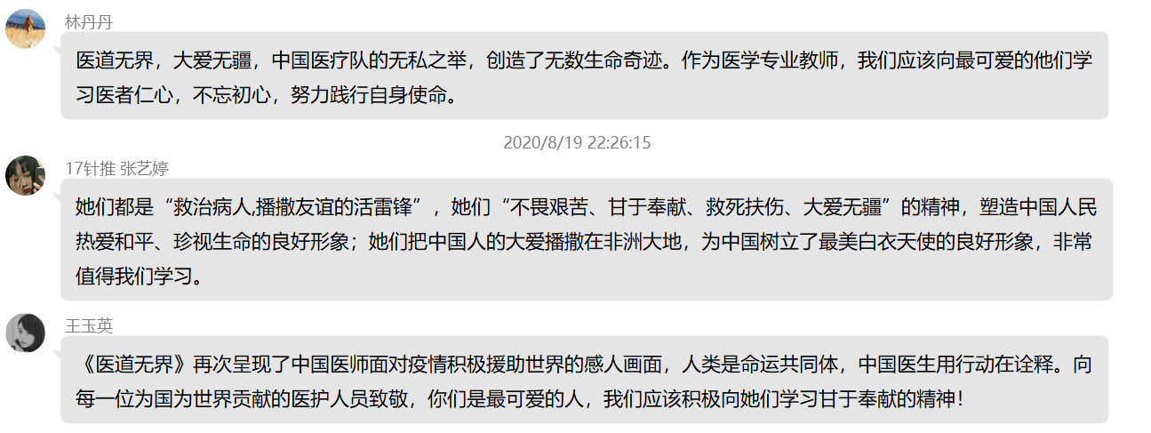 觀看之后,黨員紛紛發(fā)表感言,《醫(yī)道無界》體現(xiàn)了中國援外醫(yī)護人員不畏艱難、甘于奉獻、救死扶傷、大愛無疆的精神。我們作為醫(yī)學(xué)院校黨員教師,更應(yīng)在今后的工作中努力踐行和弘揚這種大無畏的奉獻精神。在這個具有特別意義的醫(yī)師節(jié),中國醫(yī)師群體依然沖鋒在國內(nèi)國際抗疫一線,醫(yī)道無界、大愛無疆,向白衣天使們致敬,向逆行者們致敬。
