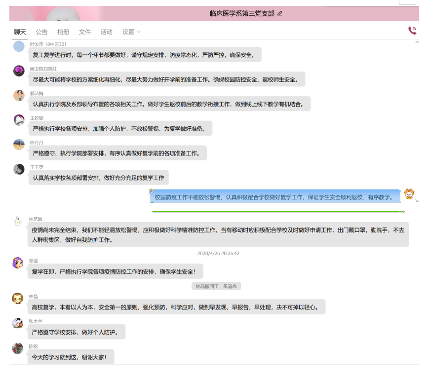 為有序推進(jìn)學(xué)生返校復(fù)學(xué)準(zhǔn)備工作,切實(shí)提升應(yīng)對突發(fā)疫情的應(yīng)急處置能力,4月26日晚,臨床系第三黨支部于線上開展《關(guān)于繼續(xù)加強(qiáng)科學(xué)精準(zhǔn)防控積極做好復(fù)工復(fù)產(chǎn)復(fù)學(xué)人員健康管理工作的通知》及《教育系統(tǒng)應(yīng)對學(xué)校突發(fā)新冠肺炎疫情處置預(yù)案》學(xué)習(xí)活動。此次活動由支部書記陳銘同志主持,支部全體黨員及預(yù)備黨員均參加。