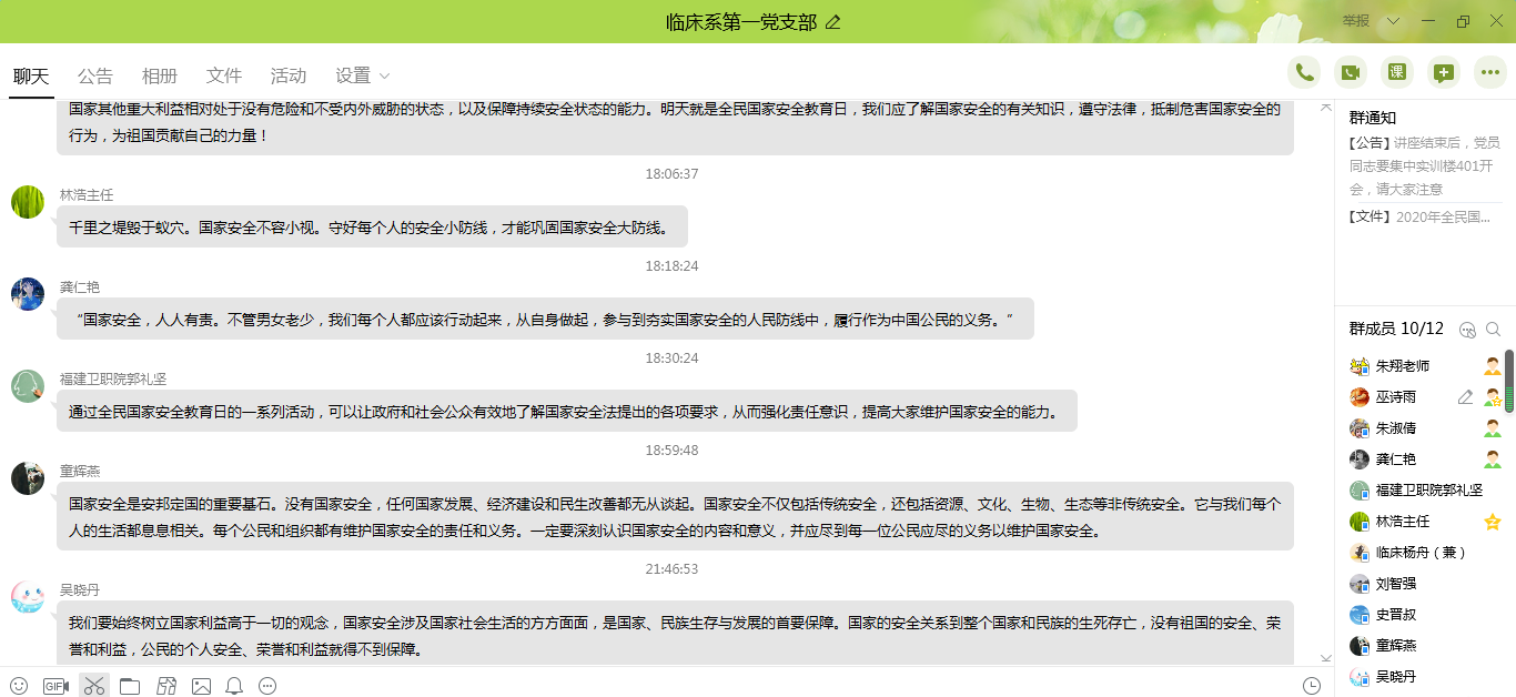 今年4月15日是第5個全民國家安全教育日,今年的主題是“堅持總體國家安全觀,統(tǒng)籌傳統(tǒng)安全和非傳統(tǒng)安全,為決勝全面建成小康社會提供堅強(qiáng)保障”。為深入學(xué)習(xí)理解習(xí)近平總書記提出的“總體國家安全觀”,提高全員維護(hù)國家安全的意識。4月15日,臨床系第一黨支部開展“國家安全教育日”主題黨日活動,此次活動由支部書記朱翔同志主持,支部全體黨員參加。