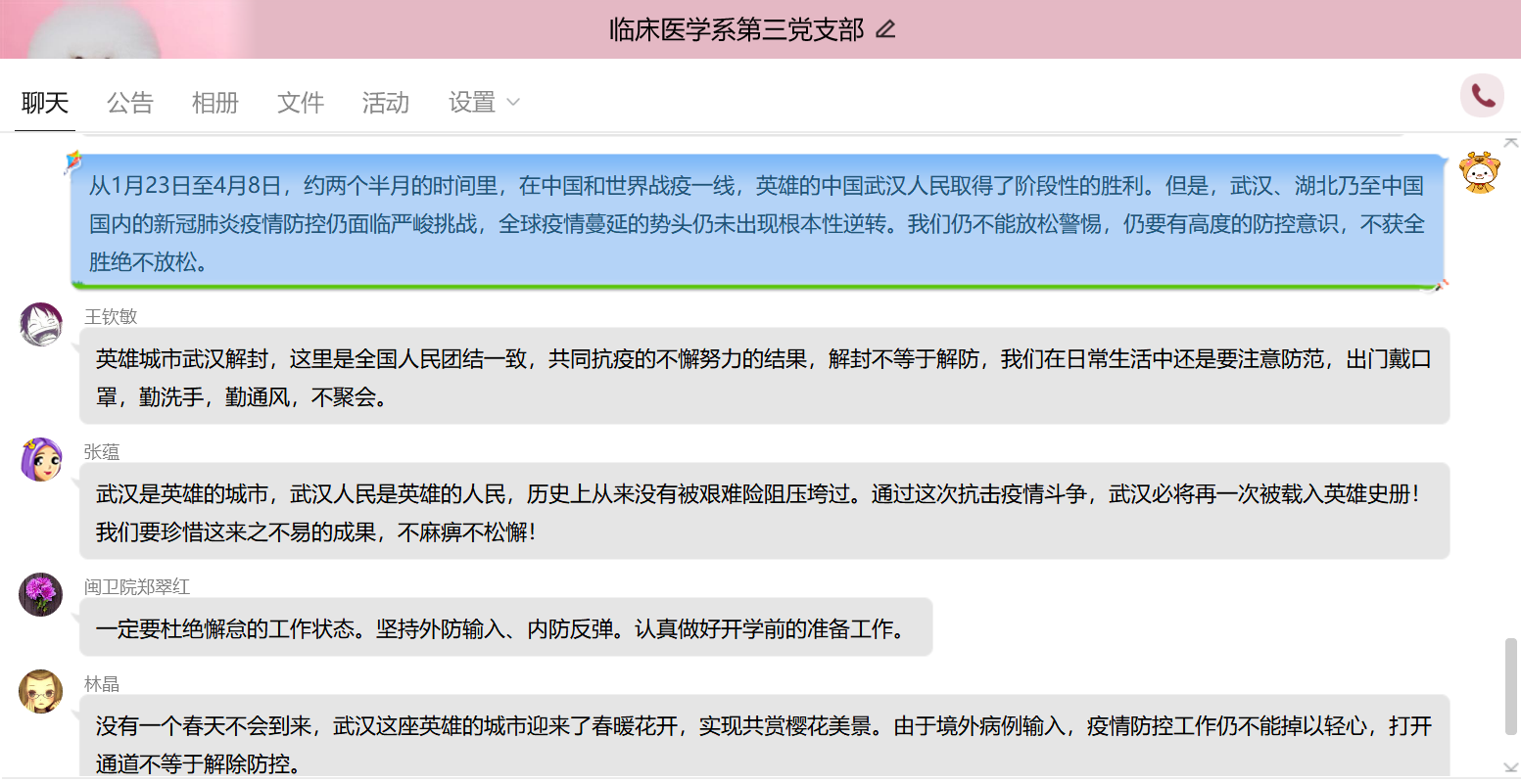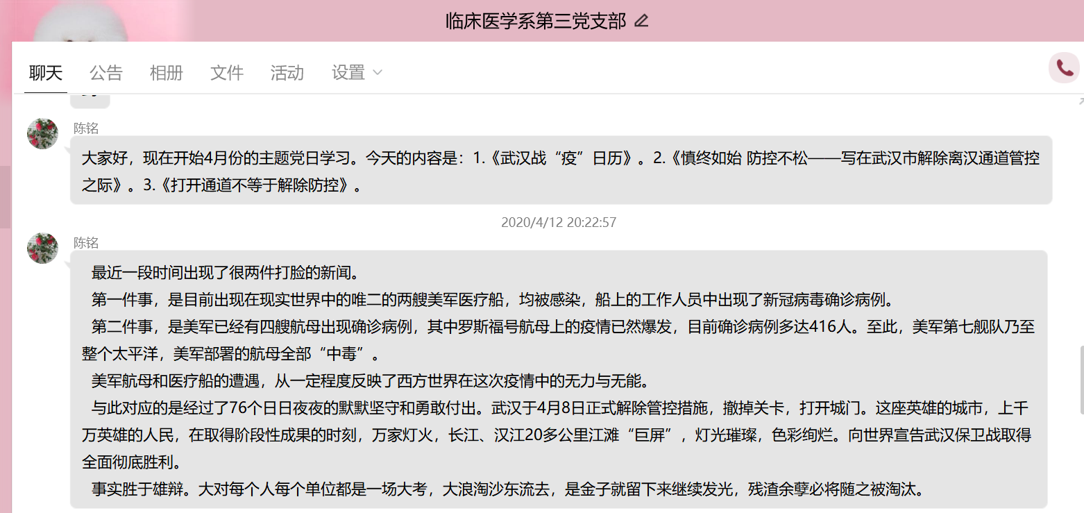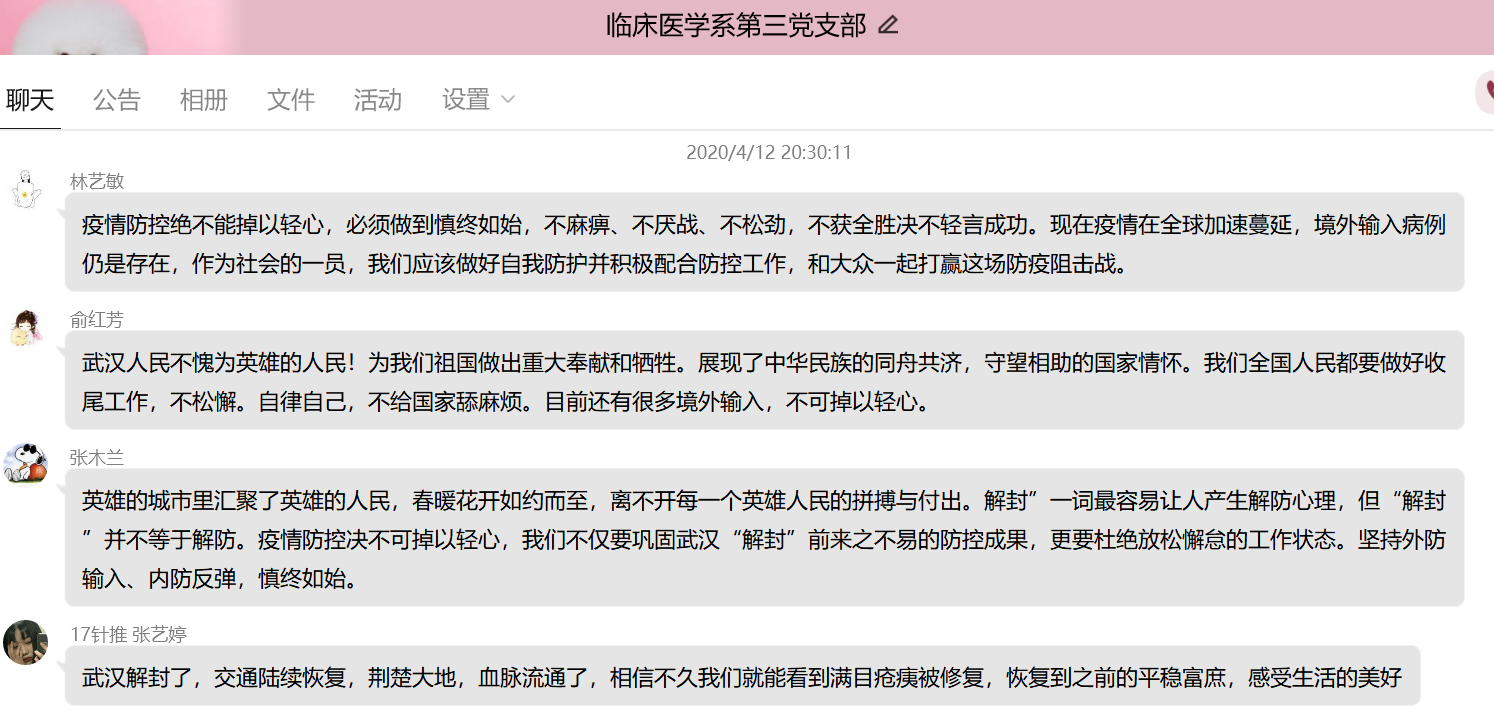 為更好地組織支部黨員學(xué)習(xí),發(fā)揮黨員的先鋒模范作用。4月12日晚上,臨床醫(yī)學(xué)系第三黨支部開(kāi)展學(xué)習(xí)《武漢戰(zhàn)“疫”日歷》、《慎終如始 防控不松——寫(xiě)在武漢市解除離漢通道管控之際》、《打開(kāi)通道不等于解除防控》等相關(guān)新聞報(bào)道的主題黨日活動(dòng),此次活動(dòng)由支部書(shū)記陳銘同志主持,支部全體黨員及預(yù)備黨員均參加。