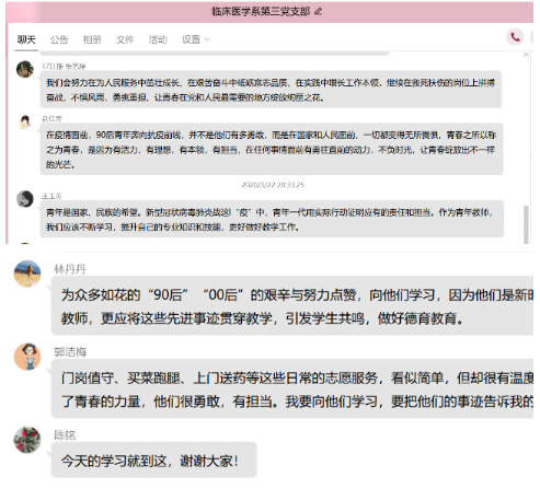3月22日晚上,臨床醫(yī)學(xué)系第三黨支部利用在線平臺(tái)開展主題為“戰(zhàn)疫中的青年力量”的學(xué)習(xí)活動(dòng),此次學(xué)習(xí)由支部書記陳銘書記主持。