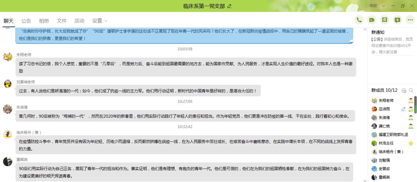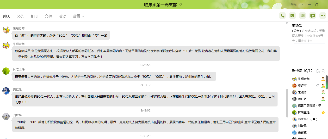 2020年3月19日上午,臨床醫(yī)學(xué)系第一黨支部組織在線學(xué)習(xí)習(xí)近平回信勉勵北京大學(xué)援鄂醫(yī)療隊全體“90后”黨員讓青春在黨和人民最需要的地方綻放絢麗之花。“在新冠肺炎疫情防控斗爭中,你們青年人同在一線英勇奮戰(zhàn)的廣大疫情防控人員一道,不畏艱險、沖鋒在前、舍生忘死,彰顯了青春的蓬勃力量,交出了合格答卷?!?月15日,習(xí)近平總書記給北京大學(xué)援鄂醫(yī)療隊全體“90后”黨員回信,向他們和奮斗在疫情防控各條戰(zhàn)線上的廣大青年致以誠摯的問候。