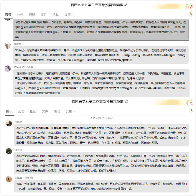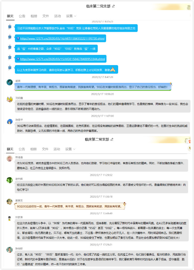 為深入學(xué)習(xí)“習(xí)近平回信勉勵(lì)北京大學(xué)援鄂醫(yī)療隊(duì)全體“90后”黨員,讓青春在黨和人民最需要的地方綻放絢麗之花”講話,3月17日上午,臨床醫(yī)學(xué)系第二黨支部全體黨員、入黨積極分子開(kāi)展了線上學(xué)習(xí)暨黨日活動(dòng),學(xué)習(xí)活動(dòng)由支部書記高長(zhǎng)花同志主持。