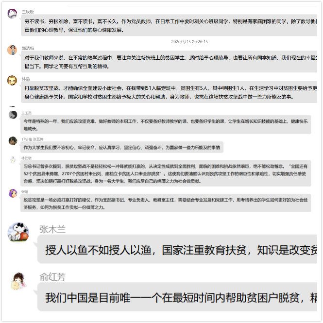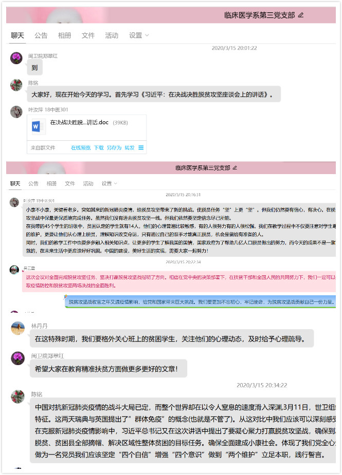3月15日晚上,臨床醫(yī)學(xué)系第三黨支部利用在線平臺(tái)開(kāi)展理論學(xué)習(xí),此次學(xué)習(xí)由支部書(shū)記陳銘書(shū)記主持,內(nèi)容為《習(xí)近平總書(shū)記在決戰(zhàn)決勝脫貧攻堅(jiān)座談會(huì)上的講話(2020年3月6日)》。