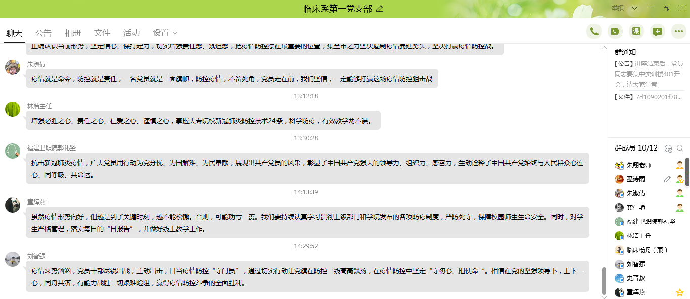經(jīng)過(guò)認(rèn)真學(xué)習(xí),同志們積極踴躍參與討論,交流學(xué)習(xí)心得。共克時(shí)艱,架起疫情防控“連心橋”,在這場(chǎng)沒有硝煙的戰(zhàn)爭(zhēng)中,沒有一個(gè)“局外人”,更沒有一個(gè)“旁觀者”,每天的疫情公報(bào)都牽動(dòng)著每一個(gè)人的心,學(xué)校的每一個(gè)決策都緊緊跟隨黨的防疫步伐。打贏這場(chǎng)硬仗,不單單要靠黨員干部的力量,更要靠我們每一個(gè)黨員認(rèn)真履行自己的職責(zé),不傳謠不信謠,以積極心態(tài)應(yīng)對(duì)疫情。按照“既要抓防控,又要抓發(fā)展”的要求,要切實(shí)負(fù)起責(zé)任,再著手細(xì)致、扎實(shí)、有序做好開復(fù)工相關(guān)準(zhǔn)備工作。積極配合學(xué)校部署,落實(shí)好防控工作,精益求精,保衛(wèi)教師和學(xué)生的健康。