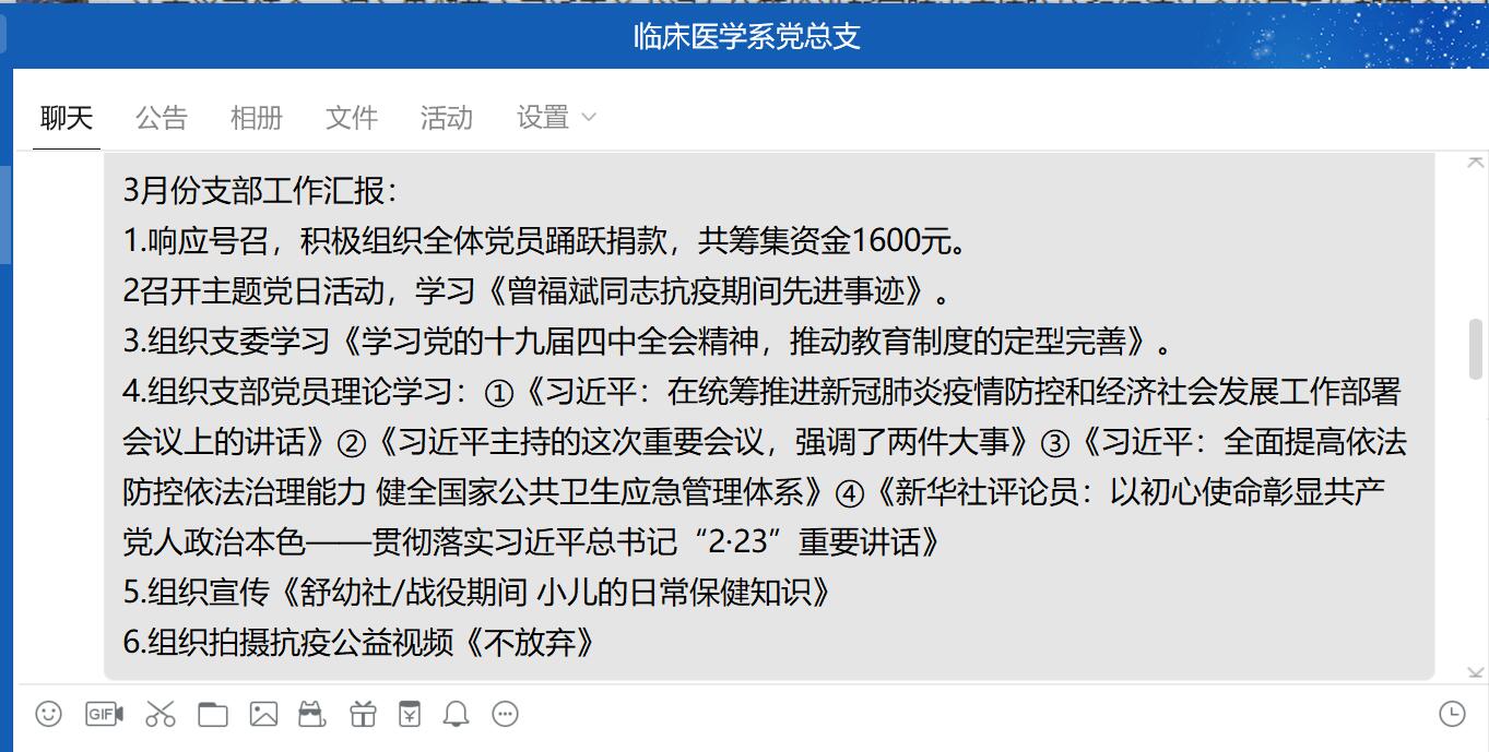 2020年3月12日,臨床醫(yī)學(xué)系黨總支在QQ群召開2月份支部書記例會(huì),會(huì)議由系黨總支負(fù)責(zé)人陳俊穎主持。
