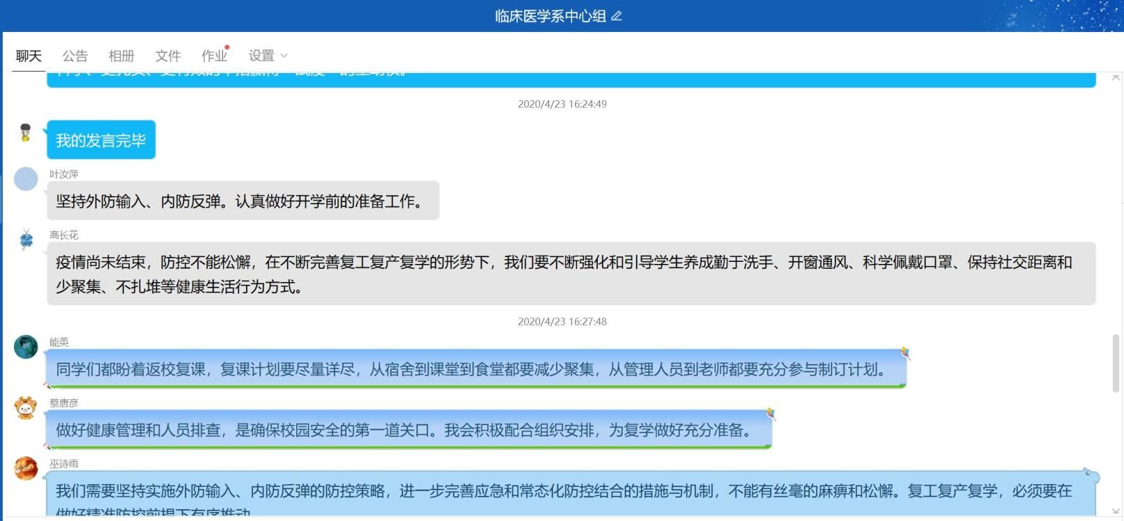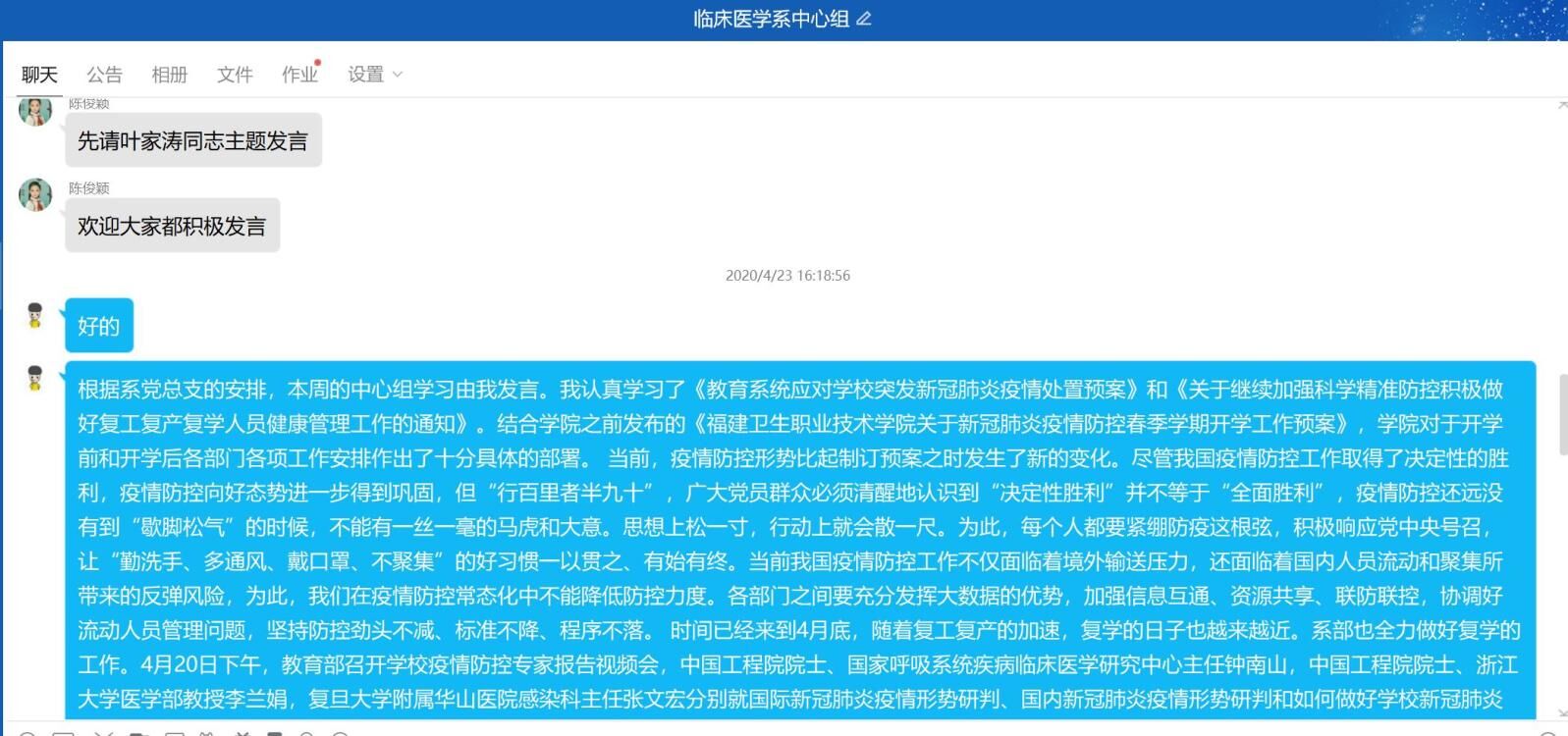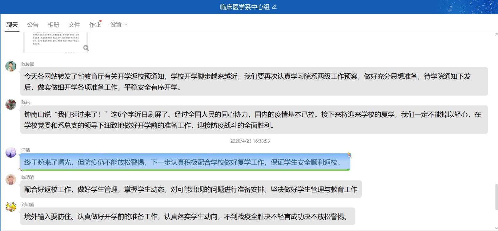 2020年4月23日,臨床醫(yī)學(xué)系在線召開中心組(擴大)學(xué)習(xí)會議,學(xué)習(xí)《教育系統(tǒng)應(yīng)對學(xué)校突發(fā)新冠肺炎疫情處置預(yù)案》、《關(guān)于繼續(xù)加強科學(xué)精準(zhǔn)防控積極做好復(fù)工復(fù)產(chǎn)復(fù)學(xué)人員健康管理工作的通知》等,會議由臨床醫(yī)學(xué)系黨總支負(fù)責(zé)人陳俊穎同志主持。