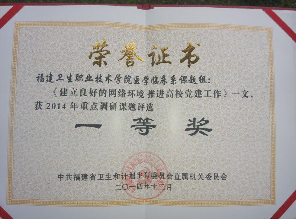 在2014年中共福建省衛(wèi)生和計(jì)劃生育委員會(huì)直屬機(jī)關(guān)委員會(huì)組織的重點(diǎn)調(diào)研課題評(píng)選活動(dòng)中,我系邱滾忠書記指導(dǎo)的課題《建立良好的網(wǎng)絡(luò)環(huán)境 推進(jìn)高校黨建工作》榮獲一等獎(jiǎng)。