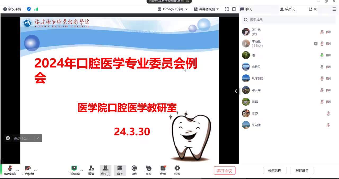 為進(jìn)一步加強(qiáng)口腔醫(yī)學(xué)專業(yè)建設(shè),提升口腔醫(yī)學(xué)專業(yè)人才培養(yǎng)質(zhì)量,醫(yī)學(xué)院口腔教研室于3月30日以線上方式召開口腔醫(yī)學(xué)專業(yè)指導(dǎo)委員會2024年例會。原福建省級機(jī)關(guān)醫(yī)院副院長潘在興,原福建醫(yī)科大學(xué)附屬口腔醫(yī)院院長盧友光、副院長程輝,福建醫(yī)科大學(xué)附屬協(xié)和醫(yī)院口腔科副主任歐陽奇明,福建醫(yī)科大學(xué)附屬第一醫(yī)院口腔科魏斌,福建省級機(jī)關(guān)醫(yī)院口腔科主任陳小華、副主任鄭艾榮,醫(yī)學(xué)院副院長鄧元榮及口腔醫(yī)學(xué)教研室全體教師參加會議。