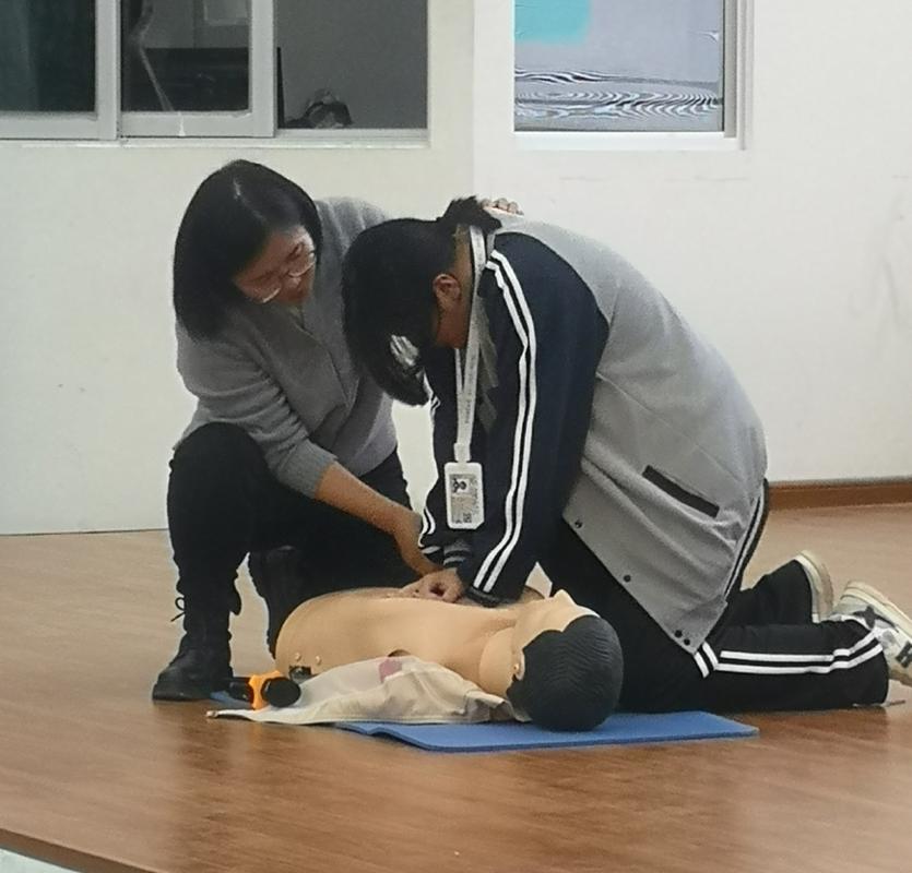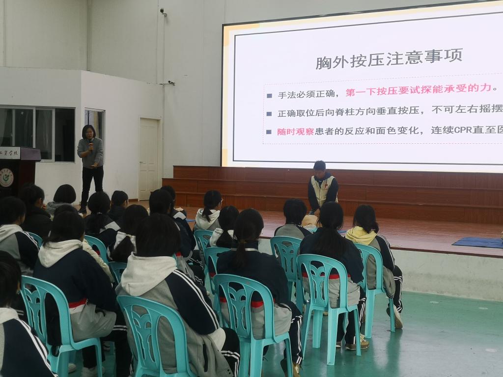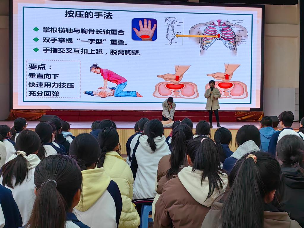我校一直高度重視急救教育工作,加強學(xué)校急救教育,培養(yǎng)師生樂于施救、敢于施救、善于施救的意識和能力,積極開展急救教育活動。培訓(xùn)課程中,我校葉榕、修麗莉、張靜雯三位老師以扎實的理論知識為基石,為學(xué)生們詳細(xì)剖析了心肺復(fù)蘇、氣道異物梗阻、自動體外除顫儀(AED)等關(guān)鍵救助方法。從心臟驟停的緊急判斷,強調(diào)“黃金4分鐘”是挽救心臟驟停的關(guān)鍵,到心肺復(fù)蘇的精準(zhǔn)按壓與人工呼吸比例,科普應(yīng)急救護知識。生動的案例與深入淺出的講解相融合,讓抽象的急救知識瞬間鮮活起來,學(xué)生們?nèi)褙炞ⅲJ(rèn)真學(xué)習(xí)。通過生動的講述和直觀的實操展示相結(jié)合,教授學(xué)生掌握心肺復(fù)蘇的操作過程及注意事項,同時與現(xiàn)場同學(xué)進行了豐富有趣的實操互動,讓同學(xué)在學(xué)習(xí)心肺復(fù)蘇急救方法的同時,通過模擬場景,上手實操加深對心肺復(fù)蘇急救的印象。